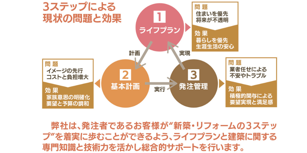 新築やリフォームをする前に、 ライフプランの作成と複数の住宅コストシミュレーションを行います。そして、 その建築プロジェクトが生涯の暮らしと家計にとって最適な選択であるかどうかを確認し、その予算限度額を設定します。
