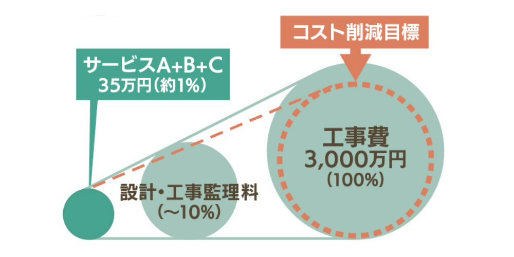 標準的な新築住宅のサービスA +B+Cの合計報酬は、工事費の1%程度です。わずかの支出で希望する住まいを手に入れることができます。
