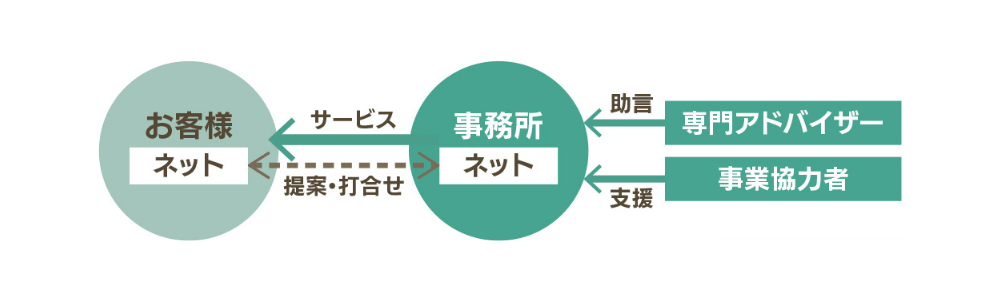 個人事務所ですが、各分野の専門アドバイザーの助言と事業協力者の支援を得て実施します。